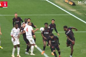 比赛第26分钟,拜仁前场任意球机会,塔门前将球挡进球门,但因手球被吹无效,拜仁仍0-1落后勒沃库森。