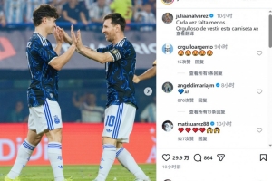 阿根廷在友谊赛中5-0击败赞比亚,阿尔瓦雷斯社媒晒出与梅西庆祝的合照,配文:“距离世界杯越来越近了,为身穿这件球衣感到自豪。”