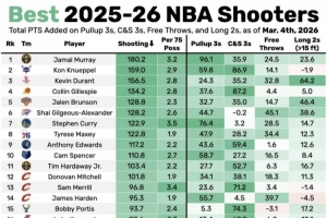 衡量参数(最后四列)依次为急停三分、接球就投三分、罚球和长两分总评分