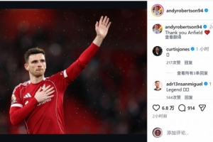 罗伯逊将在本赛季结束后离开利物浦,他在社交媒体上晒出谢场的照片,配文:“谢谢你,安菲尔德。”