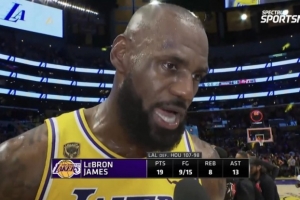 体育资讯4月19日讯 今日,湖人在季后赛首轮G1中107-98主场击败火箭,系列赛1-0领先。赛后,湖人球星詹姆斯接受了采访。