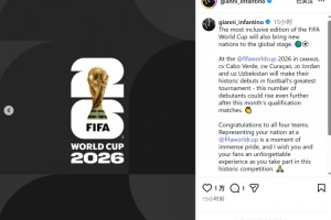 “最具包容性的一届世界杯将让更多国家登上世界舞台。在加拿大、墨西哥和美国联合举办的2026年世界杯上, 佛得角、库拉索、约旦和乌兹别克斯坦将历史性地首次在这项最伟大的足球赛事中亮相,随着本月预选赛的进行,新晋参赛国数量可能继续增加。